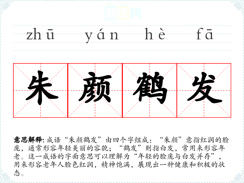 成语“朱颜鹤发”由四个字组成:“朱颜”意指红润的脸庞,通常形容年轻美丽的容貌;“鹤发”则指白发,常用来形容年老。这一成语的字面意思可以理解为“年轻的脸庞与白发并存”,用来形容老年人脸色红润,精神饱满,展现出一种健康和积极的状态。