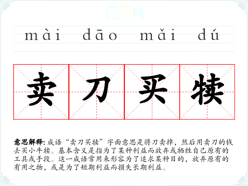成语“卖刀买犊”字面意思是将刀卖掉,然后用卖刀的钱去买小牛犊。基本含义是指为了某种利益而放弃或牺牲自己原有的工具或手段。这一成语常用来形容为了追求某种目的,放弃原有的有用之物,或是为了短期利益而损失长期利益。