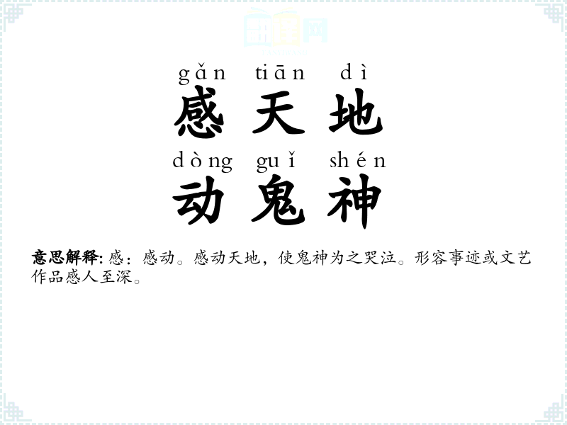 动:感动;感:感动。使天地鬼神受到感动。形容事迹或作品十分感人。 |