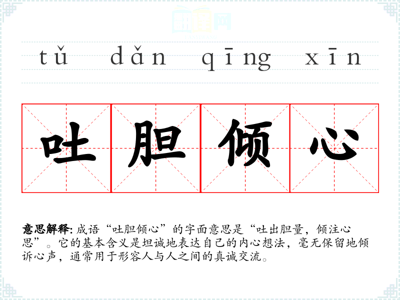 “吐胆倾心”并没有明确的历史典故或文学出处,但它的构成反映了古代汉语中对情感表达的重视。成语中的“胆”象征着勇气和真诚,而“心”则代表着内心的真实想法。这个成语可能是基于对心灵深处感受的深刻理解而形成的。