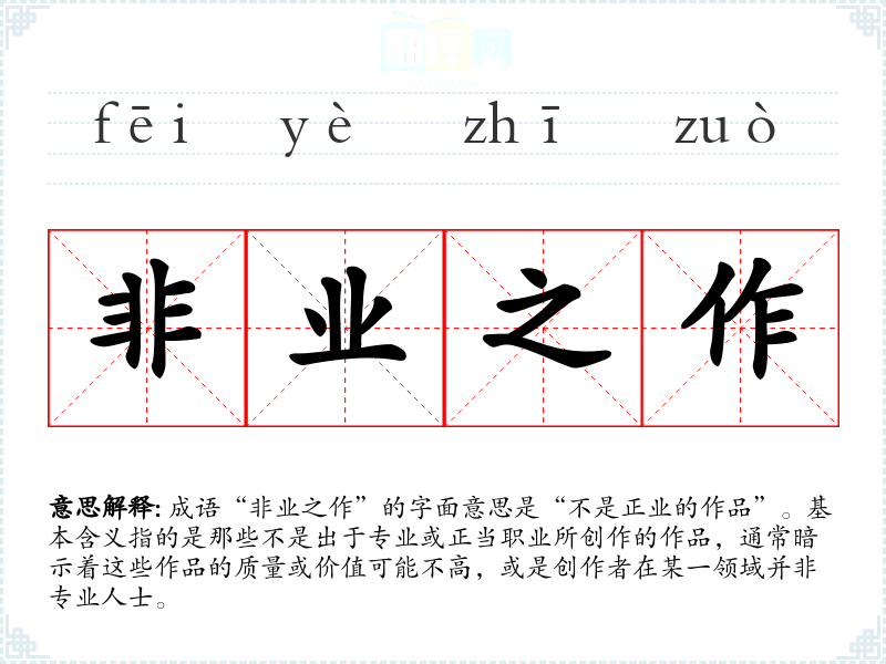 成语“非业之作”的字面意思是“不是正业的作品”。基本含义指的是那些不是出于专业或正当职业所创作的作品,通常暗示着这些作品的质量或价值可能不高,或是创作者在某一领域并非专业人士。