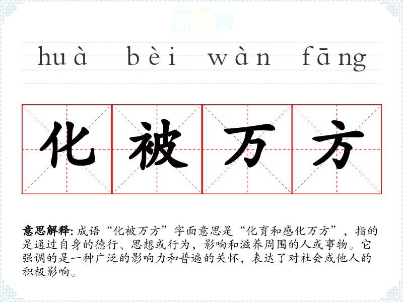 成语“化被万方”字面意思是“化育和感化万方”,指的是通过自身的德行、思想或行为,影响和滋养周围的人或事物。它强调的是一种广泛的影响力和普遍的关怀,表达了对社会或他人的积极影响。