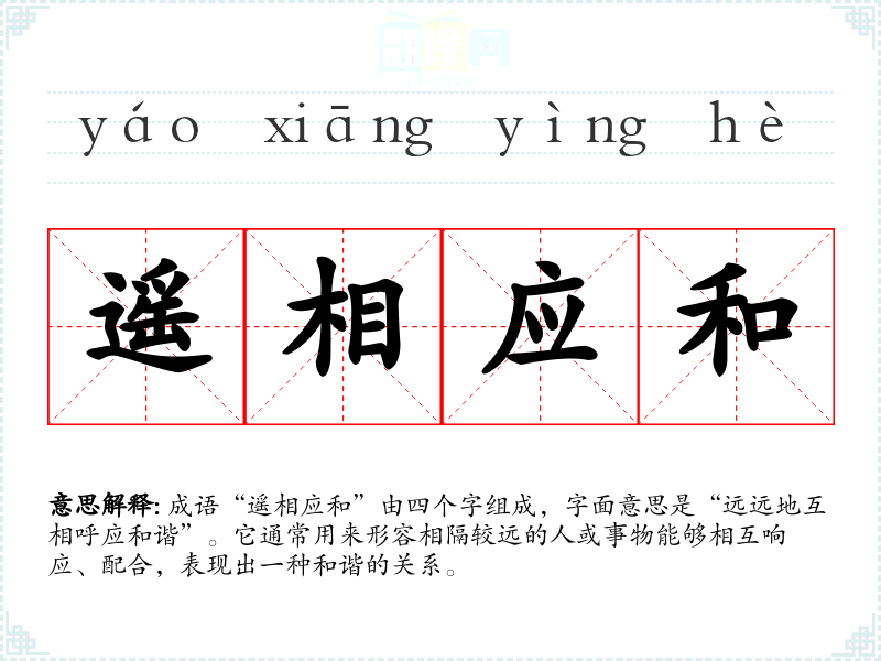 成语“遥相应和”由四个字组成,字面意思是“远远地互相呼应和谐”。它通常用来形容相隔较远的人或事物能够相互响应、配合,表现出一种和谐的关系。