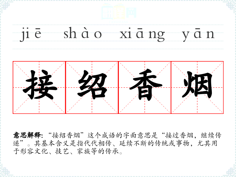 “接绍香烟”这个成语的字面意思是“接过香烟,继续传递”。其基本含义是指代代相传、延续不断的传统或事物,尤其用于形容文化、技艺、家族等的传承。