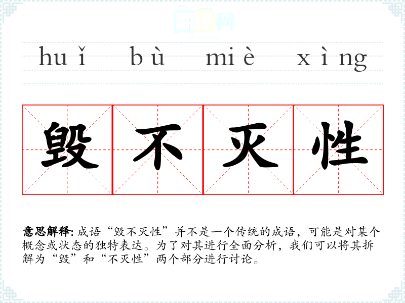 成语“毁不灭性”并不是一个传统的成语,可能是对某个概念或状态的独特表达。为了对其进行全面分析,我们可以将其拆解为“毁”和“不灭性”两个部分进行讨论。