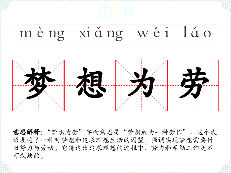 “梦想为劳”字面意思是“梦想成为一种劳作”。这个成语表达了一种对梦想和追求理想生活的渴望,强调实现梦想需要付出努力与劳动。它传达出追求理想的过程中,努力和辛勤工作是不可或缺的。