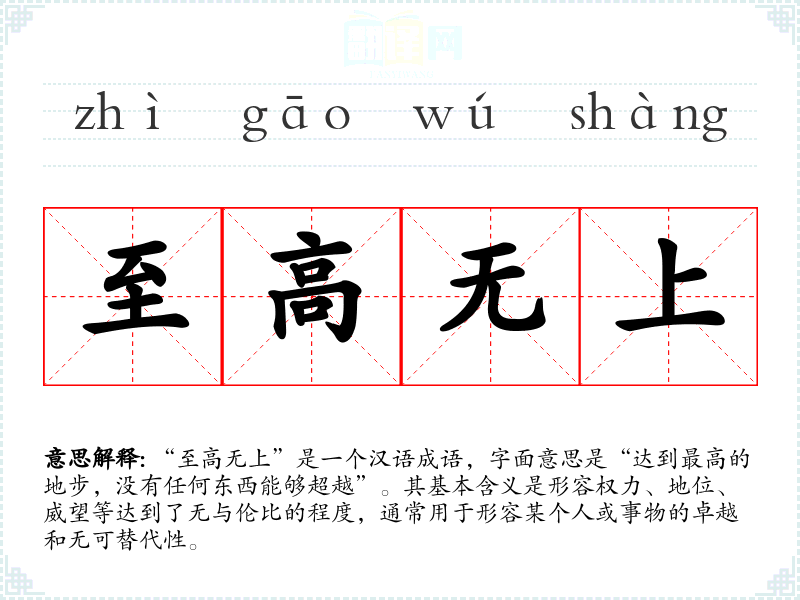“至高无上”是一个汉语成语,字面意思是“达到最高的地步,没有任何东西能够超越”。其基本含义是形容权力、地位、威望等达到了无与伦比的程度,通常用于形容某个人或事物的卓越和无可替代性。