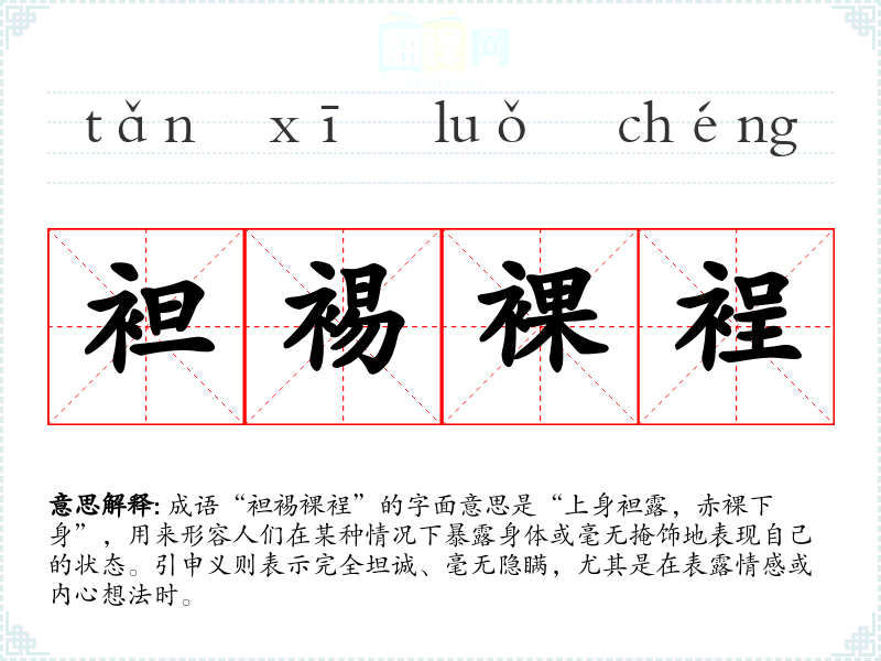 成语“袒裼裸裎”的字面意思是“上身袒露,赤裸下身”,用来形容人们在某种情况下暴露身体或毫无掩饰地表现自己的状态。引申义则表示完全坦诚、毫无隐瞒,尤其是在表露情感或内心想法时。