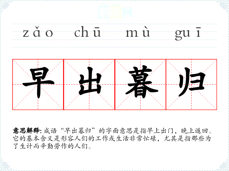 成语“早出暮归”的字面意思是指早上出门,晚上返回。它的基本含义是形容人们的工作或生活非常忙碌,尤其是指那些为了生计而辛勤劳作的人们。