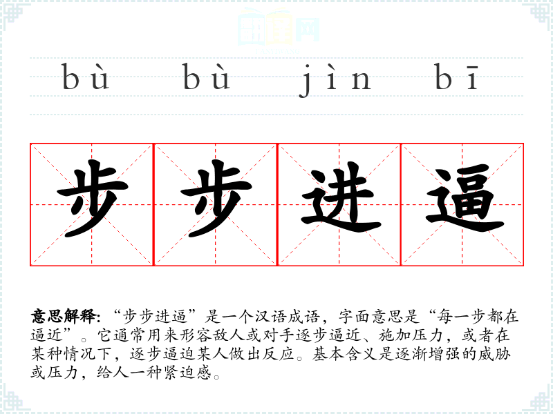 在英语中,类似的表达可以是“step by step closing in”,虽然意思相近,但“步步进逼”更强调了压力和逼迫的紧迫感。不同文化背景对“逼近”的理解和应用可能会影响成语的使用效果。