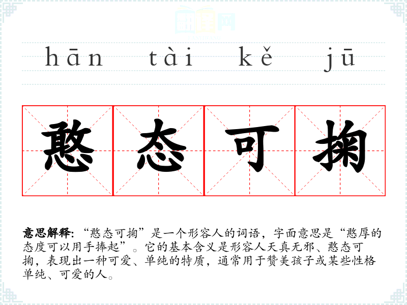 “憨态可掬”是一个形容人的词语,字面意思是“憨厚的态度可以用手捧起”。它的基本含义是形容人天真无邪、憨态可掬,表现出一种可爱、单纯的特质,通常用于赞美孩子或某些性格单纯、可爱的人。