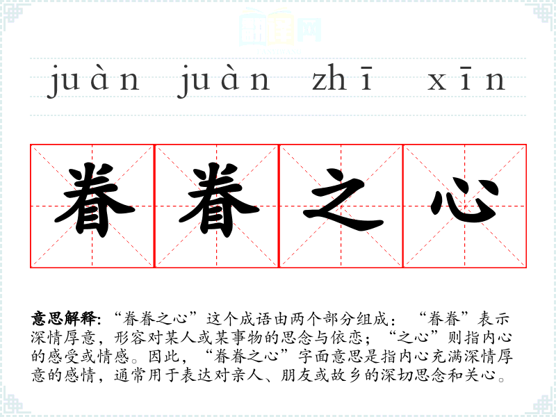 “眷眷之心”这个成语由两个部分组成: “眷眷”表示深情厚意,形容对某人或某事物的思念与依恋;“之心”则指内心的感受或情感。因此,“眷眷之心”字面意思是指内心充满深情厚意的感情,通常用于表达对亲人、朋友或故乡的深切思念和关心。