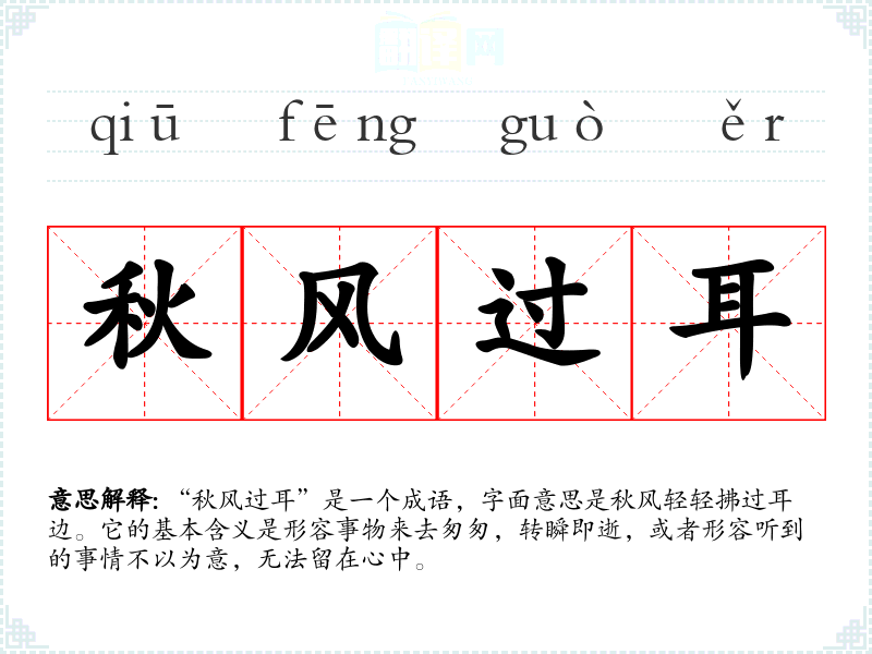 “秋风过耳”这一成语的具体来源并不明确,但可以推测与秋天的风有关。秋风是凉爽的,象征着时光的流逝和生命的转瞬即逝。结合“过耳”这个词,可以理解为听到的消息或言辞就像秋风一样,轻轻飘过,不会在心中留下深刻的印象。