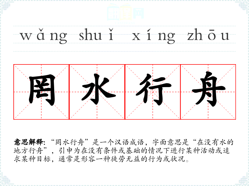 “罔水行舟”是一个汉语成语,字面意思是“在没有水的地方行舟”,引申为在没有条件或基础的情况下进行某种活动或追求某种目标,通常是形容一种徒劳无益的行为或状况。