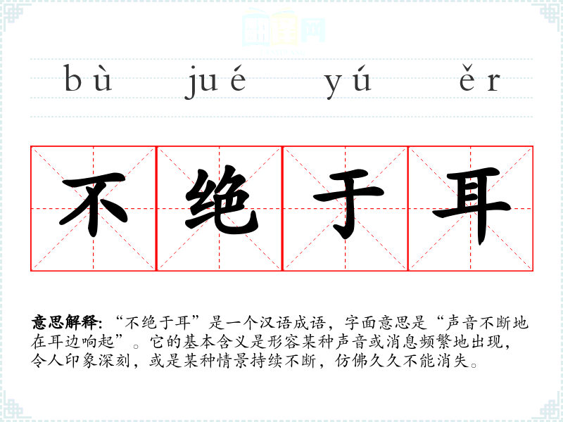 “不绝于耳”是一个汉语成语,字面意思是“声音不断地在耳边响起”。它的基本含义是形容某种声音或消息频繁地出现,令人印象深刻,或是某种情景持续不断,仿佛久久不能消失。