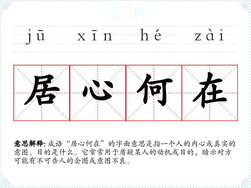 成语“居心何在”的字面意思是指一个人的内心或真实的意图、目的是什么。它常常用于质疑某人的动机或目的,暗示对方可能有不可告人的企图或意图不良。