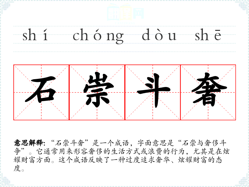 “石崇斗奢”是一个成语,字面意思是“石崇与奢侈斗争”。它通常用来形容奢侈的生活方式或浪费的行为,尤其是在炫耀财富方面。这个成语反映了一种过度追求奢华、炫耀财富的态度。