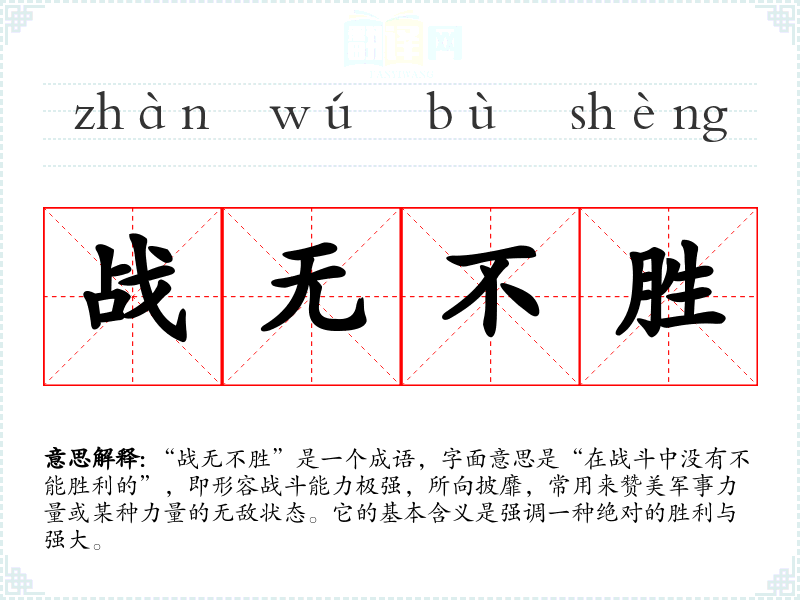“战无不胜”是一个成语,字面意思是“在战斗中没有不能胜利的”,即形容战斗能力极强,所向披靡,常用来赞美军事力量或某种力量的无敌状态。它的基本含义是强调一种绝对的胜利与强大。