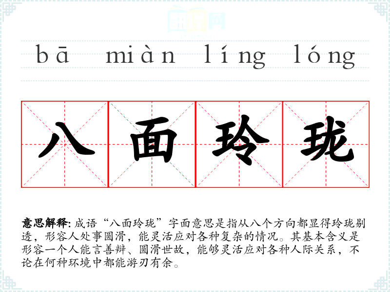 成语“八面玲珑”字面意思是指从八个方向都显得玲珑剔透,形容人处事圆滑,能灵活应对各种复杂的情况。其基本含义是形容一个人能言善辩、圆滑世故,能够灵活应对各种人际关系,不论在何种环境中都能游刃有余。