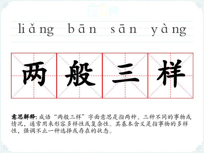 成语“两般三样”字面意思是指两种、三种不同的事物或情况,通常用来形容多样性或复杂性。其基本含义是指事物的多样性,强调不止一种选择或存在的状态。