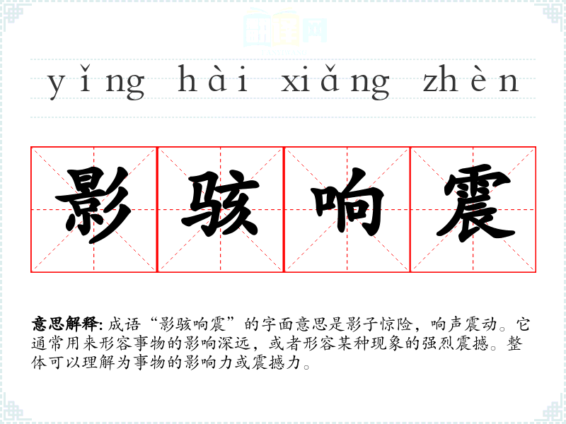 成语“影骇响震”的字面意思是影子惊险,响声震动。它通常用来形容事物的影响深远,或者形容某种现象的强烈震撼。整体可以理解为事物的影响力或震撼力。