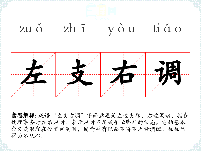 成语“左支右调”字面意思是左边支撑、右边调动,指在处理事务时左右应对,表示应对不足或手忙脚乱的状态。它的基本含义是形容在处置问题时,因资源有限而不得不周旋调配,往往显得力不从心。