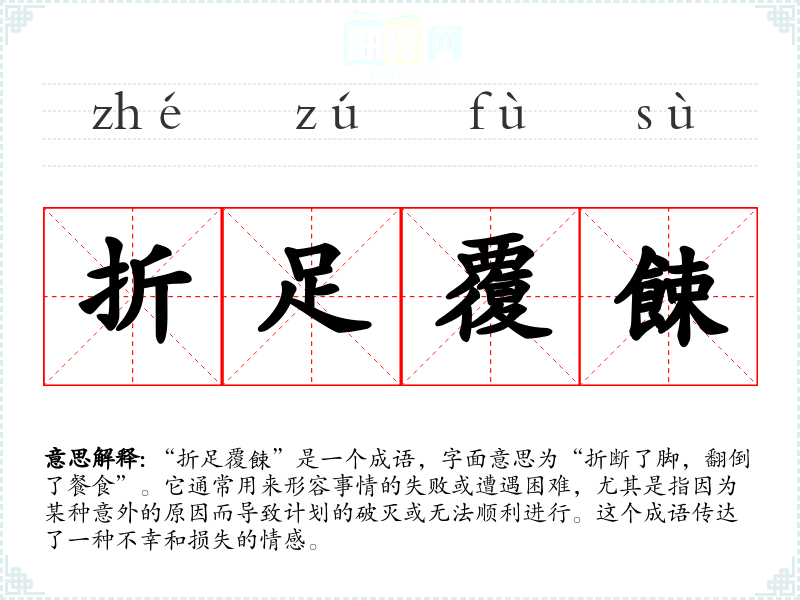 “折足覆餗”出自《东周列国志》,在古典文学中常常用来形容因意外因素导致的失败和困扰。它的构成是由“折足”和“覆餗”两个部分组成,前者指的是失去行走能力,后者则是指食物被翻倒,象征着失去的机会和资源。