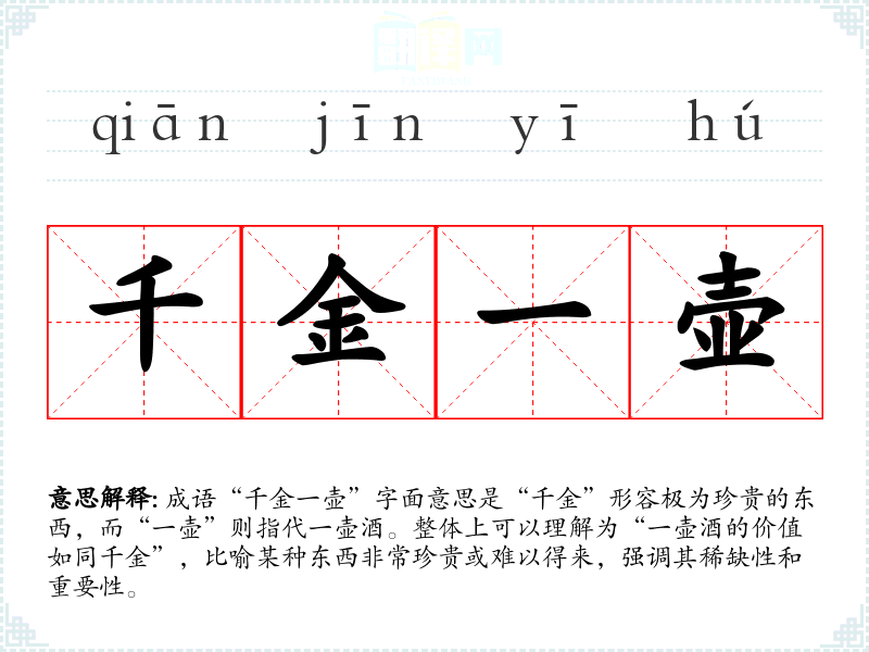 成语“千金一壶”字面意思是“千金”形容极为珍贵的东西,而“一壶”则指代一壶酒。整体上可以理解为“一壶酒的价值如同千金”,比喻某种东西非常珍贵或难以得来,强调其稀缺性和重要性。