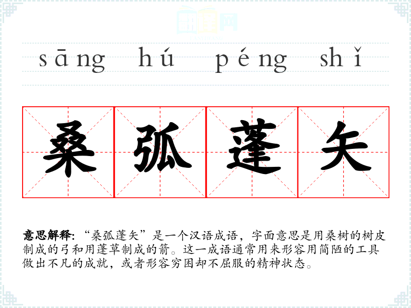 “桑弧蓬矢”是一个汉语成语,字面意思是用桑树的树皮制成的弓和用蓬草制成的箭。这一成语通常用来形容用简陋的工具做出不凡的成就,或者形容穷困却不屈服的精神状态。