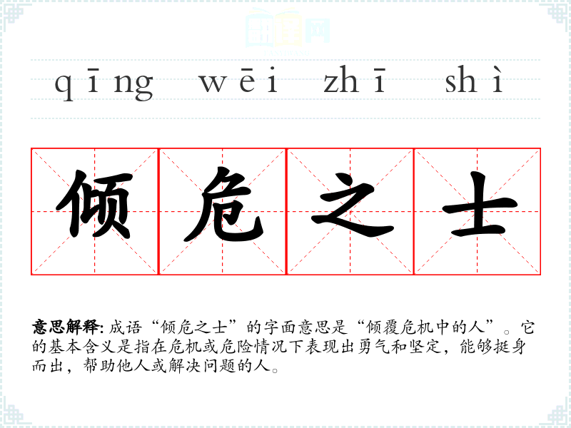 成语“倾危之士”的字面意思是“倾覆危机中的人”。它的基本含义是指在危机或危险情况下表现出勇气和坚定,能够挺身而出,帮助他人或解决问题的人。