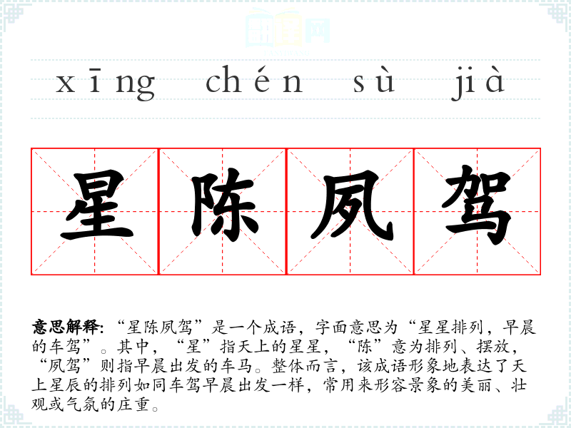 | 星辰夙驾 | 陈:列;夙:早。星夜驾车行驶。 |