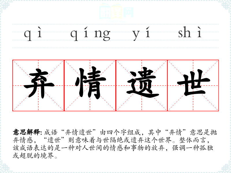 成语“弃情遗世”由四个字组成,其中“弃情”意思是抛弃情感,“遗世”则意味着与世隔绝或遗弃这个世界。整体而言,该成语表达的是一种对人世间的情感和事物的放弃,强调一种孤独或超脱的境界。