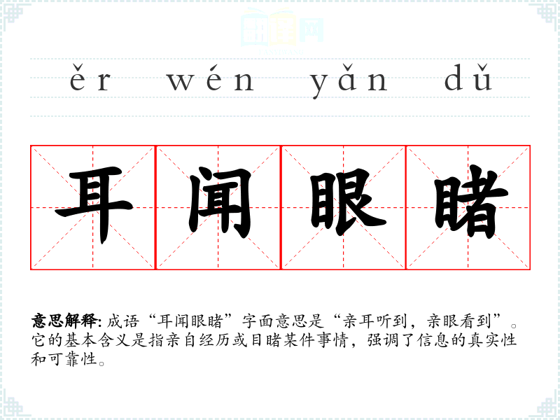 成语“耳闻眼睹”字面意思是“亲耳听到,亲眼看到”。它的基本含义是指亲自经历或目睹某件事情,强调了信息的真实性和可靠性。