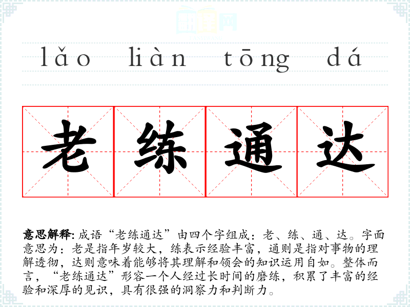 成语“老练通达”由四个字组成:老、练、通、达。字面意思为:老是指年岁较大,练表示经验丰富,通则是指对事物的理解透彻,达则意味着能够将其理解和领会的知识运用自如。整体而言,“老练通达”形容一个人经过长时间的磨练,积累了丰富的经验和深厚的见识,具有很强的洞察力和判断力。