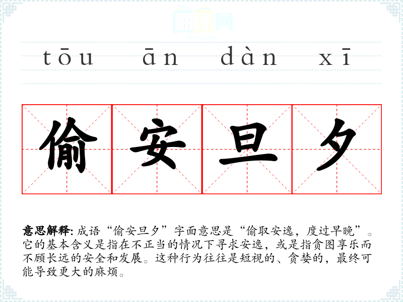- 反义成语:奋发向上、努力拼搏。这些成语强调追求进步和不懈奋斗的精神,与“偷安旦夕”的意义形成鲜明对比。