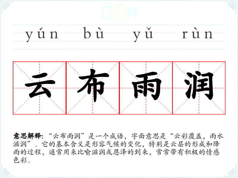该成语的具体来源并不明确,但可以联想到古代诗词中常用“云”和“雨”来描绘自然景象,表现出自然的恩赐与生机。雨水的到来象征着丰收与希望,因此“云布雨润”通常被用来描绘一种良好的气候条件,或者比喻一种美好的事物即将到来。