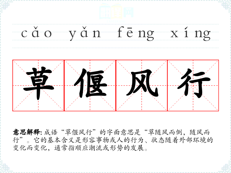成语“草偃风行”的字面意思是“草随风而倒,随风而行”。它的基本含义是形容事物或人的行为、状态随着外部环境的变化而变化,通常指顺应潮流或形势的发展。