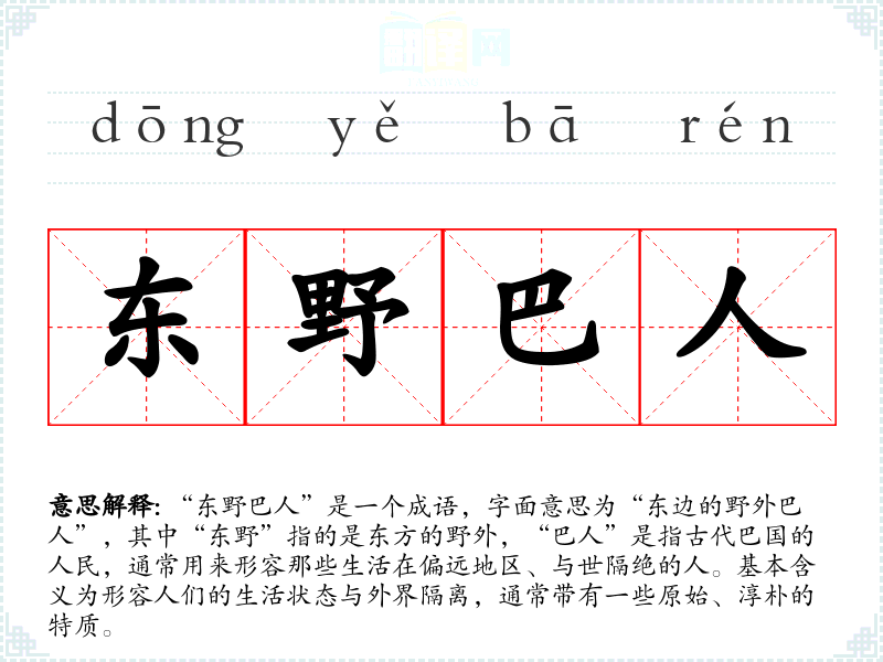 “东野巴人”是一个成语,字面意思为“东边的野外巴人”,其中“东野”指的是东方的野外,“巴人”是指古代巴国的人民,通常用来形容那些生活在偏远地区、与世隔绝的人。基本含义为形容人们的生活状态与外界隔离,通常带有一些原始、淳朴的特质。