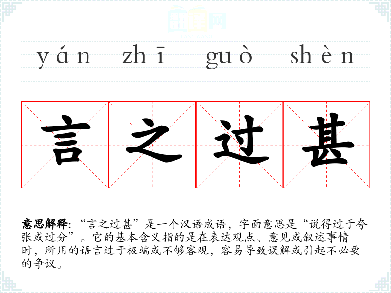 “言之过甚”是一个汉语成语,字面意思是“说得过于夸张或过分”。它的基本含义指的是在表达观点、意见或叙述事情时,所用的语言过于极端或不够客观,容易导致误解或引起不必要的争议。