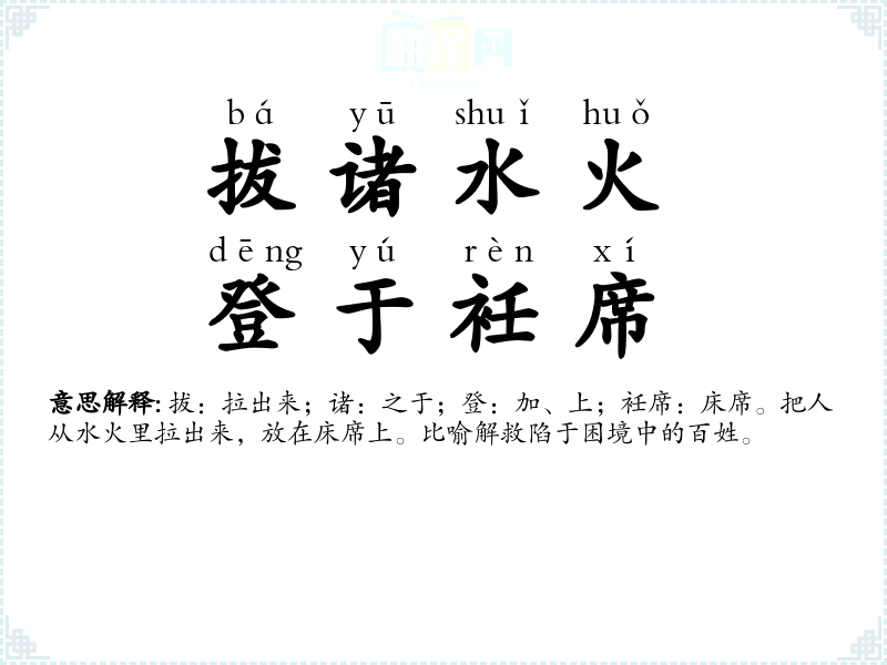拔:拉出来;诸:之于;登:加、上;衽席:床席。把人从水火里拉出来,放在床席上。比喻解救陷于困境中的百姓。 |