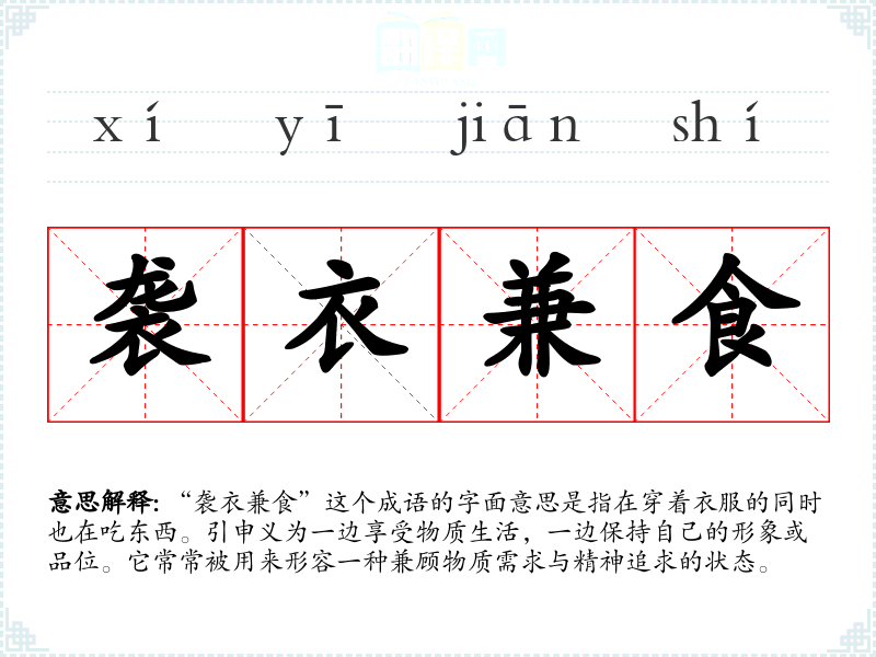 “袭衣兼食”这个成语的字面意思是指在穿着衣服的同时也在吃东西。引申义为一边享受物质生活,一边保持自己的形象或品位。它常常被用来形容一种兼顾物质需求与精神追求的状态。