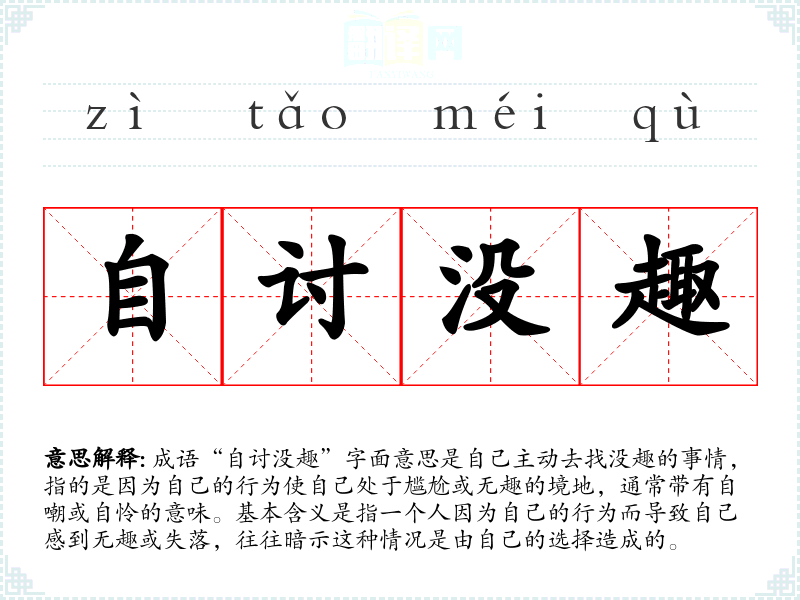 成语“自讨没趣”字面意思是自己主动去找没趣的事情,指的是因为自己的行为使自己处于尴尬或无趣的境地,通常带有自嘲或自怜的意味。基本含义是指一个人因为自己的行为而导致自己感到无趣或失落,往往暗示这种情况是由自己的选择造成的。