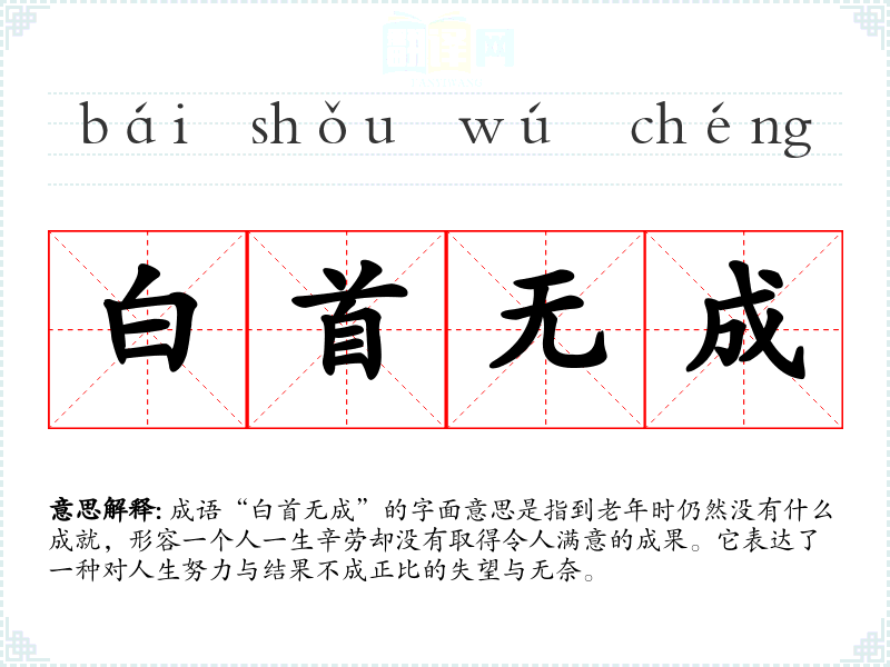 成语“白首无成”的字面意思是指到老年时仍然没有什么成就,形容一个人一生辛劳却没有取得令人满意的成果。它表达了一种对人生努力与结果不成正比的失望与无奈。