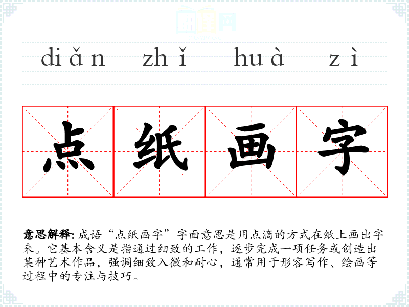 成语“点纸画字”字面意思是用点滴的方式在纸上画出字来。它基本含义是指通过细致的工作,逐步完成一项任务或创造出某种艺术作品,强调细致入微和耐心,通常用于形容写作、绘画等过程中的专注与技巧。