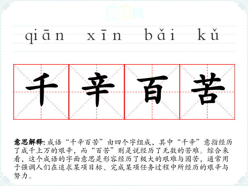成语“千辛百苦”由四个字组成,其中“千辛”意指经历了成千上万的艰辛,而“百苦”则是说经历了无数的苦难。综合来看,这个成语的字面意思是形容经历了极大的艰难与困苦,通常用于强调人们在追求某项目标、完成某项任务过程中所经历的艰辛与努力。