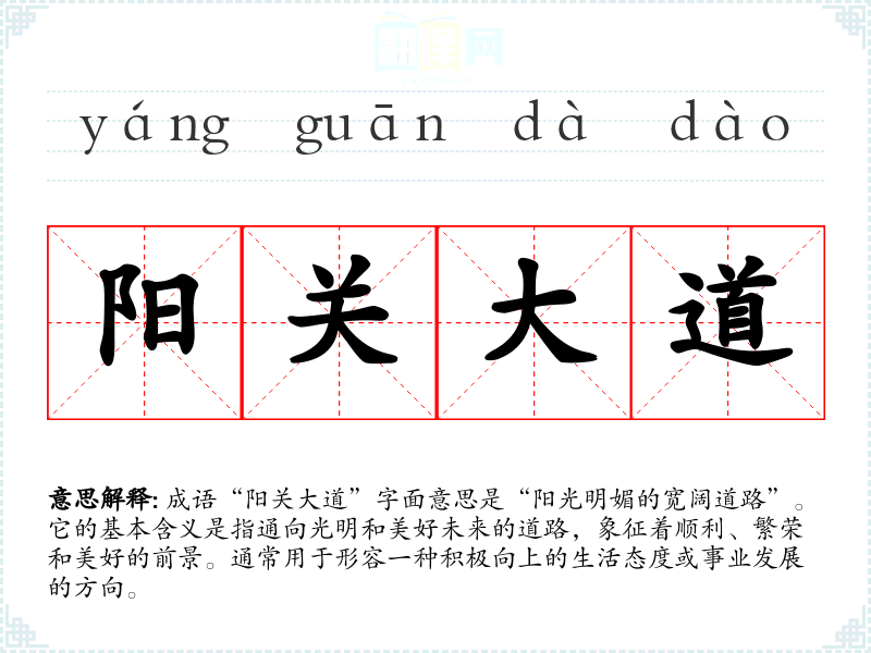 “阳关大道”在中华文化中,象征着乐观向上的人生态度,适用于鼓励和激励。尤其是在现代社会,面对各种挑战和压力时,这一成语的使用显得尤为重要,能够给予人们希望和动力。