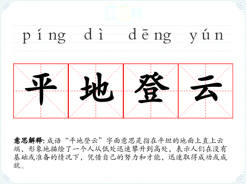 成语“平地登云”字面意思是指在平坦的地面上直上云端,形象地描绘了一个人从低处迅速攀升到高处,表示人们在没有基础或准备的情况下,凭借自己的努力和才能,迅速取得成功或成就。