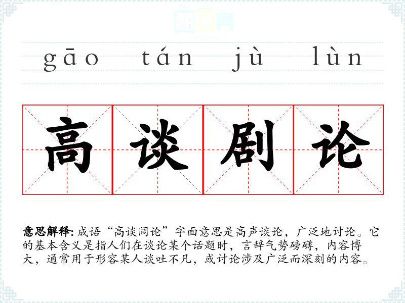 成语“高谈阔论”字面意思是高声谈论,广泛地讨论。它的基本含义是指人们在谈论某个话题时,言辞气势磅礴,内容博大,通常用于形容某人谈吐不凡,或讨论涉及广泛而深刻的内容。