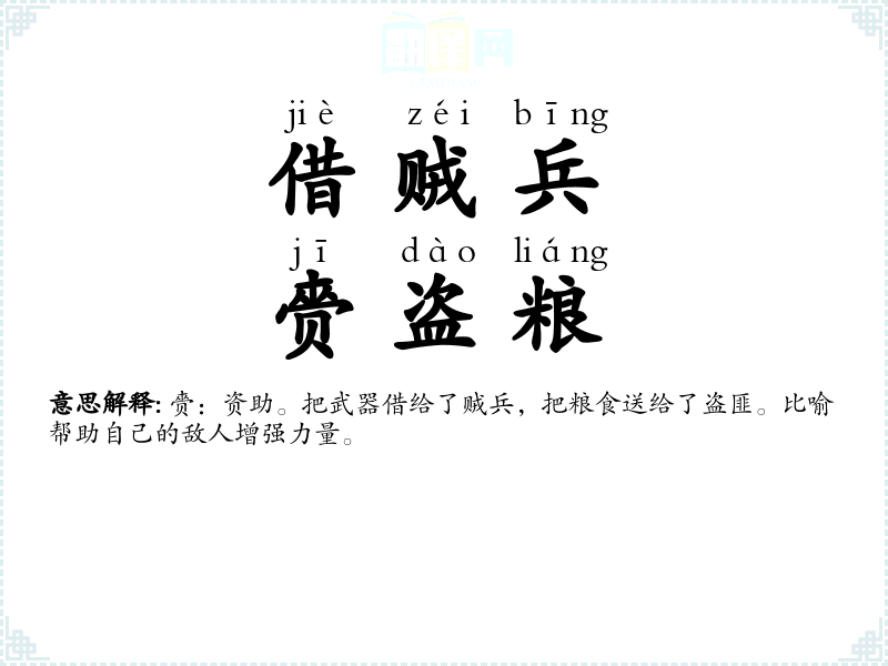 | 借贼兵,赍盗粮 | 赍:资助。把武器借给了贼兵,把粮食送给了盗匪。比喻帮助自己的敌人增强力量。 |