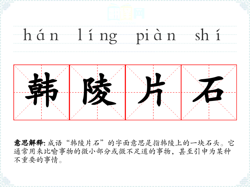 成语“韩陵片石”的字面意思是指韩陵上的一块石头。它通常用来比喻事物的微小部分或微不足道的事物,甚至引申为某种不重要的事情。